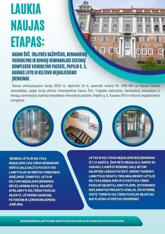 Kauno arkivyskupijos kurija 2023 m. lapkričio 24 d. pasirašė sutartį Nr. SRB-464 su Kauno miesto savivaldybe, pagal kurią skirtas finansavimas Kauno Švč. Trejybės bažnyčios, bernardinų vienuolyno ir kunigų seminarijos statinių komplekso vienuolyno pastate, Papilio g. 5, Kaunas liftui ir keltuvui neįgaliesiems įrengti.