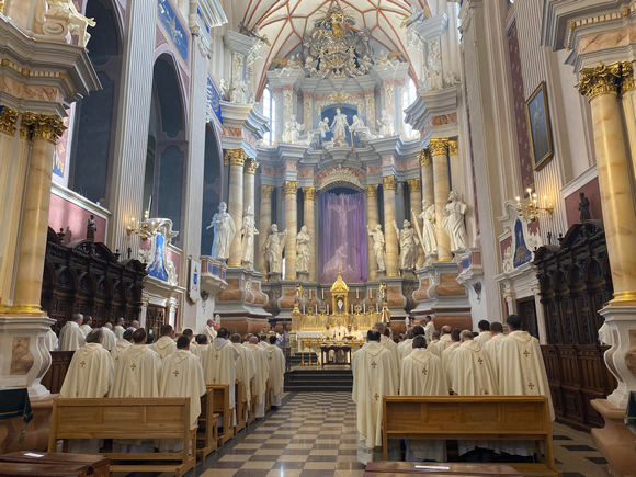 Kauno senamiesčio praeiviai ir šių iškilmių dalyviai šį Didžiojo ketvirtadienio rytmetį turėjo retesnę progą ir džiaugsmą išvysti gausų dvasininkų būrį iš visų 7 arkivyskupijos dekanatų, iš artimesnių ar tolimesnių miestų, miestelių ir kaimų parapijų, tarnaujančių po Šventimų dar tik kelerius metus ar savo kunigiškąją tarnystę jau skaičiuojančių dešimtmečiais.