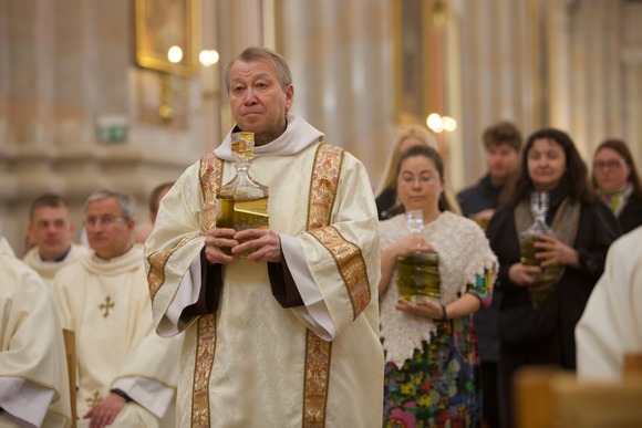 Šv. Krizmos Mišių liturgijoje įvairiu jos metu buvo palaiminti Ligonių ir katechumenų aliejai, o arkivyskupo įkvėpimu ir malda – konsekruota šventoji Krizma. Aliejus prie altoriaus atnašų procesijoje su duona ir vynu atnešė pasauliečiai, mūsų arkivyskupijoje tarnaujantys ligonių sielovadoje, katechumenate.