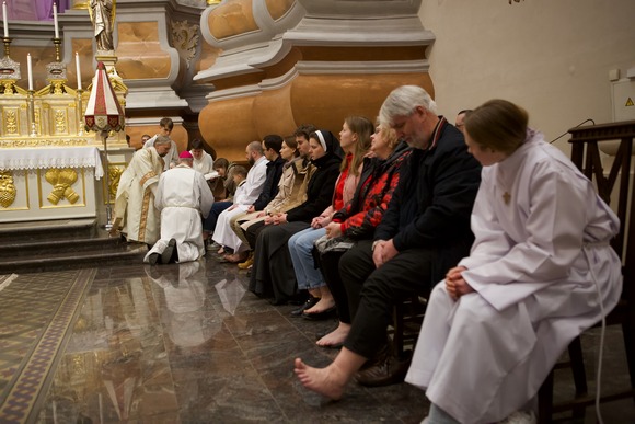 Su atminimu konkrečios meilės veiksmo, kurį pats Jėzus atliko pasilenkdamas prie savo pašauktųjų mokinių kojų, šioje Mišių liturgijoje buvo atlikta kojų plovimo apeiga. Po homilijos arkivyskupas Kęstutis, padedamas patarnautojų, nusivilko arnotą, persijuosė rankšluosčiu, pasilenkė prie žmonių ir nuplovė kojas dvylikai arkivyskupijos institucijų bendradarbių – savo pagalbininkų, kurie jo siunčiami tarnauja žmonėms katechezės, Carito, humanitarinės pagalbos Lietuvoje apsistojusiems Ukrainos gyventojams, šeimos, rengimo Santuokai bei kitose srityse.