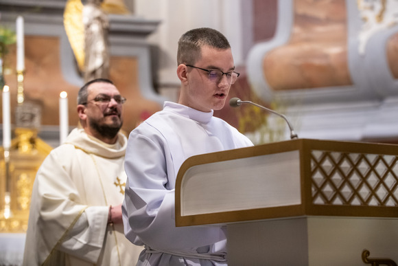 Ganytojų vardu (jie tądien dalyvavo sesers Nijolės Sadūnaitės laidotuvėse) jaunimą pasveikino ir Eucharistijai vadovavo kunigas Andrzejus BINIEK OFM Cap.