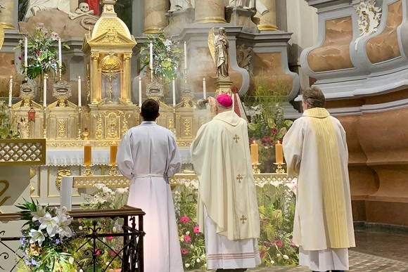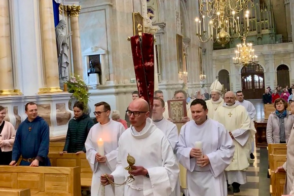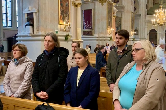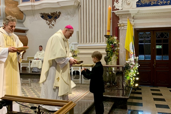 Balandžio 10 d., minėdami Carito Lietuvoje atkūrimo 35-metį, meldėmės už karitatyvinės misijos bendradarbius, savanorius, geradarius, per visą šį laikotarpį prisidėjusius prie Carito misijos. Drauge melstis atvyko Carito Vaiko gerovės instituto komanda. Su ja drauge prašėme jiems ir įtėvių bei globėjų šeimoms reikalingų malonių. Atnašų procesijoje ukrainiečių ir lietuvių vaikai nešė duoną, vyną ir savo rašytus laiškus Dievui.