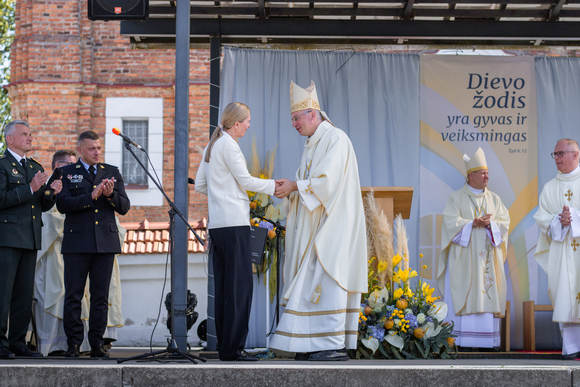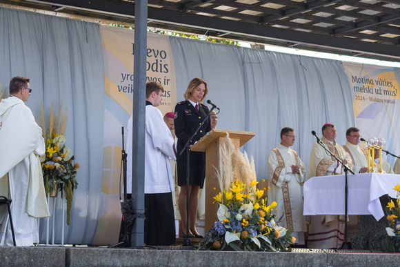 Eucharistijos pabaigoje pareigūnų bendruomenės vardu žodį tarusi Vidaus reikalų ministrė Agnė Bilotaitė padėkojo už bendradarbiavimą. Neseniai buvo pasirašytas valstybės ir Bažnyčios bendradarbiavimo susitarimas dėl civilinės saugos. „Laikmetis pasikeitė, svarbu dirbti išvien“, – sakė ministrė A. Bilotaitė, padėkojusi už maldą Šiluvoje ir kitose tikinčiųjų bendruomenėse, kurios patikina, jog meldžiasi ir asmeniškai. Ministrė atkreipė dėmesį, jog nuolat rūpinamasi palaikyti pareigūnų motyvaciją, o Lietuvos institucijos pagal pasitikėjimą yra priekyje tarp Europos Sąjungos šalių. Ministrė kaip dovaną drauge su meno paveikslu įteikė arkivyskupui išgyvenimo krepšį, tuo primindama, kokiais laikais gyvename ir kaip turime būti pasirengę.