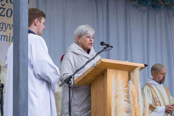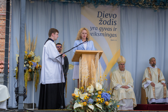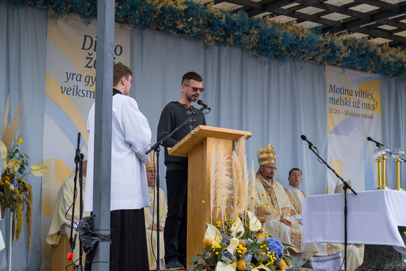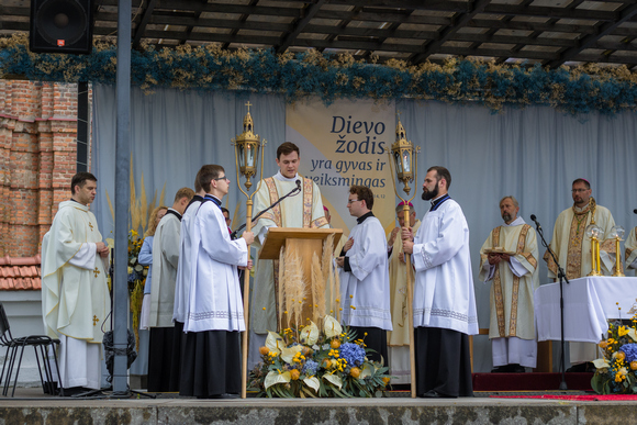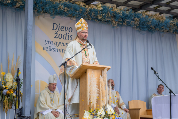 Vidudienį aikštėje švenčiant Padėkos Eucharistiją arkivyskupas V. Kulbokas atkreipė dėmesį, jog mūsų malda yra konkreti ir maldoje kiekvienas žmogus – nuo ganytojų iki pačių mažiausiųjų – turi teisę pavesti Dievui šį pasaulį.