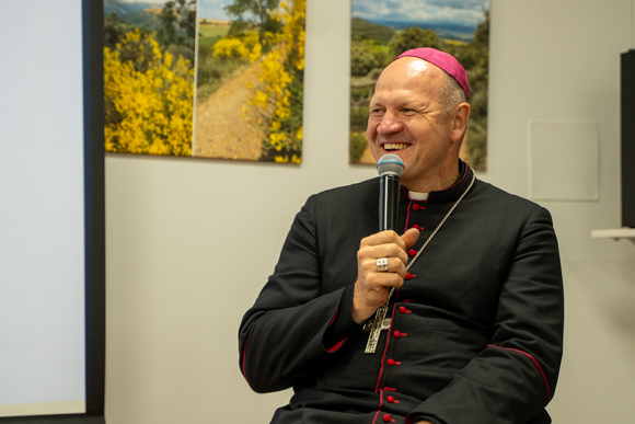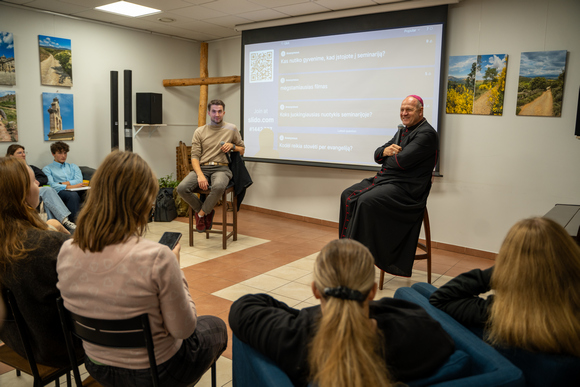 Po šv. Mišių arkikatedros parapijos namuose tęsėme pažintį su vyskupu Sauliumi – ne tik ragavome jo mėgstamo deserto – želės su vaisiais – bet ir sužinojome, kad vyskupas vos pasitaikius progai mėgsta ištrūkti į gamtą, o pakviestas į svečius ilgai nedvejoja ir, jei tik turi galimybę, kvietimu pasinaudoja.