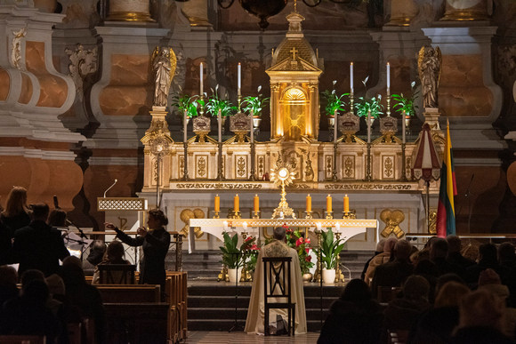 Nemažai kauniečių apsilankė Kauno arkikatedroje čia stabtelėdami pagarbinti Švenčiausiojo Sakramento, pabūti, kur Viešpats labai arti, su širdies troškimu padėkoti už šiandienos mūsų laisvę ir jos teikiamas galimybes ir, žinoma, kad laisvė, taip brangi ir mums dovanota, būtų dovanota ir mūsų sesei Ukrainai, ir visiems kraštams, teisėtai ginantiems savo žemę. Galbūt ir nerami šio laiko situacija bei taikos trapumas skatino dar gausiau nei įprastai dalyvauti šioje maldoje.