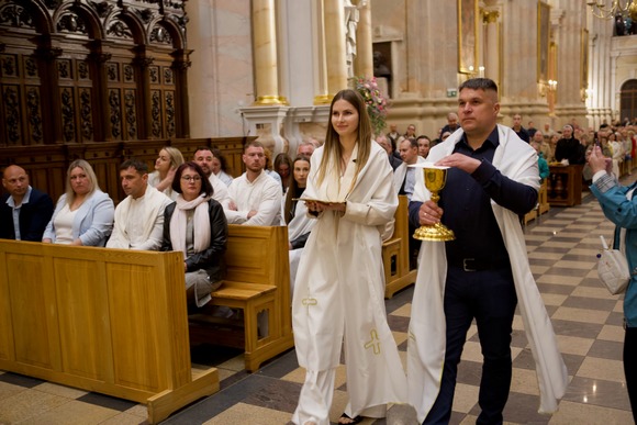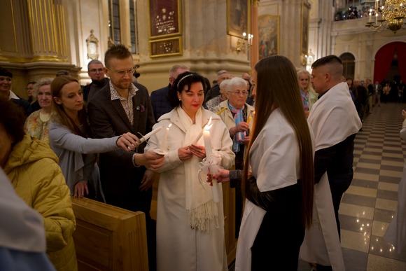 Neofitai – naujai pakrikštytieji – buvo pakviesti pereiti per šventovę ir įžiebti žvakeles kitiems žmonėms, dabar jau tapusiems tikėjimo broliais ir seserimis...