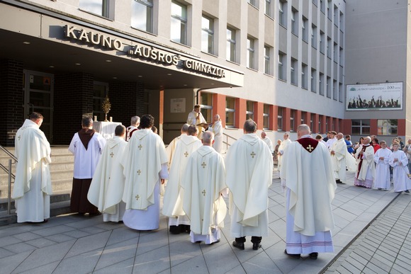 Ant „Aušros“ gimnazijos laiptų pagarbinus Viešpatį, diakonas Arūnas Kučikas atkreipė dėmesį į daugybę mums duotų Dievo dovanų. Viena jų maistas – kad juo pasimėgautume, kad prie bendro stalo patirtume bendravimo džiaugsmą. Jėzus irgi mėgavosi bendryste, valgymu ir su mokiniais, ir su nusidėjėliais. Tačiau Jėzaus įsakymu plušėti turime ne dėl žemiško, gendančio maisto, bet dėl išliekančio. Ieškoti to, kas patenkintų egzistencinį alkį. Toks maistas yra Jis pats, Jo Kūnas ir Kraujas.
