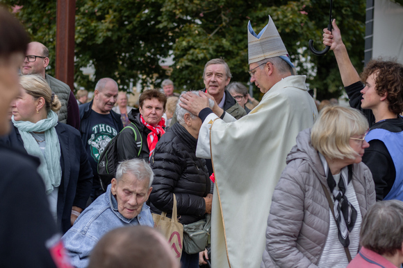 Vidudienį aikštėje arkivyskupas Kęstutis Kėvalas su šiais piligrimais, taip pat ir gydančiais, slaugančiais, įvairiopais būdais tarnaujančiais fiziniame ir dvasiniame varge meldėsi Rožinį.