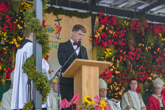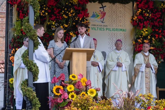 Apaštalinį nuncijų, brolius vyskupus, kunigus, diakonus, seminaristus, visus piligrimus džiugiai sveikinęs Kauno arkivyskupas metropolitas Kęstutis Kėvalas pagarsino dar vieną ypatingą žinią – iš Šiluvos perduodamas sveikinimas popiežiui Leonui XIV, švenčiančiam 70 metų amžiaus jubiliejų. Už Šventąjį Tėvą vėliau melstasi ir Visuotinėje maldoje, ypač kad jo pastangos dėl taikos ir brolybės brandintų vaisius.