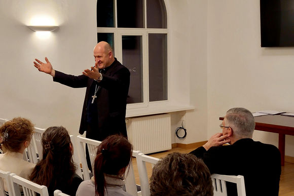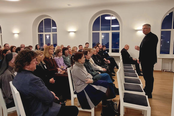 Arkivyskupas Kęstutis Kėvalas tarė sveikinimo žodį gausiai atvykusiems muzikams. Dėkodamas už tarnystę parapijose, pasidalijo žinia apie ateinančius 2026-uosius – jubiliejinius arkivyskupijos įsteigimo metus, kviesdamas pagalvoti apie tai, kokios temos galėtų būti svarbios organizuojant parapijų muzikų sielovadą.