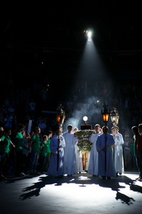 Ant kelių prieš apšviestą Švč. Sakramentą suklupo visa „Žalgirio“ arena. „Tai buvo puikus įrodymas, kad mes tikime, garbiname ir lenkiamės Dievui“, – prisiminė LJD dalyvis.