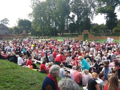 Pasibaigus šv. Mišioms Šiluvos mokyklos stadione karitiečiai dalyvavo bendroje agapėje, vaišinosi jubiliejiniu tortu, jiems smagią muzikos valandėlę dovanojo Vilniaus folkloro ansamblis „Laukis“.