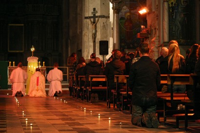 Vakaro centras ir šį kartą buvo Švč. Sakramento adoracija. Švč. Sakramentą pagarbinimui išstatė Kauno Šv. Vincento Pauliečio (Petrašiūnų) parapijos klebonas kun. Tomaszas Pilchas OFM Cap. Jo nuoširdus mąstymas ir maldavimai Eucharistinio Jėzaus artumoje jautriai atliepė daugelio susirinkusių žmonių nuotaiką ir tuos maldos žodžius, kuriais kiekvienas savo širdyje troško pasidalyti su Viešpačiu. O Jis, kaip sakė kun. Tomaszas, žvelgia į žmogaus širdį, kurioje visko daug – ir pykčių, ir pavydų, ir nesutarimų, ir gobšumų, ir neištikimybių. Bet Viešpats mato ir žmogaus pastangas, kokias dvasines kovas jis kovoja, norėdamas būti geras ir šventas.