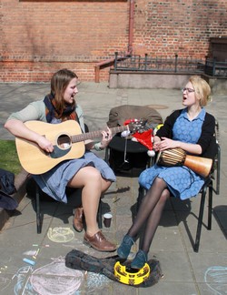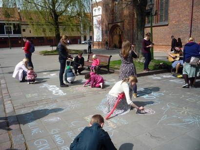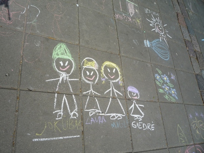 Pasivaišinę kakava ir sausainiais, vaikai su tėveliais įsitraukė į piešimą ant asfalto, pūtė balionus, fotografavosi, o praeivius Gyvybės dienos proga gyva muzika sveikino Šeimos centro savanoriai.