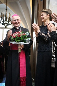 Pasveikinęs arkivyskupus Lionginą ir Sigitą, apaštališkasis nuncijus arkivysk. Pedro López Quintana perskaitė išskirtinį pasveikinimą – popiežiaus Pranciškaus, kurį Šventasis Tėvas kaip broliškos meilės ženklą skyrė arkivyskupui emeritui Sigitui Tamkevičiui, suteikdamas apaštališkąjį palaiminimą vyskupystės konsekracijos 25-mečio proga.