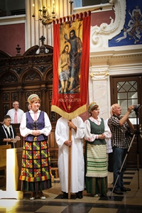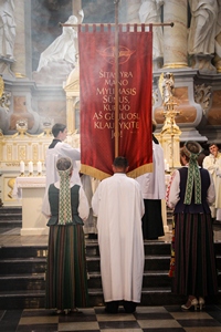 Prieš suteikdamas ganytojiškąjį palaiminimą arkivyskupas pašventino naująją arkivyskupijos vėliavą – joje Jėzaus krikšto atvaizdas su mūsų globėju šv. Jonu Krikštytoju (iš arkikatedros Švč. Sakramento koplyčios altoriaus 1895–1898 metais datuojamo paveikslo) bei naujasis arkivyskupijos šūkis – „Taisykite Viešpačiui kelią!“, kuris lydės arkivyskupijos bendruomenę į paskutinį dešimtmetį ir jau nebe už kalnų, kaip priminė arkivyskupas, laukiantį 100-ąjį jubiliejų!