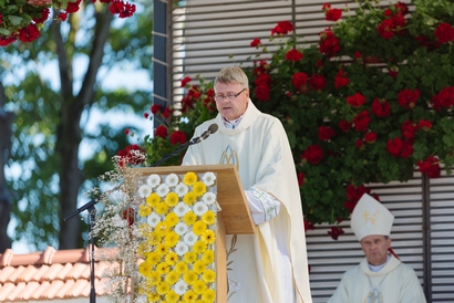 Šventojo Kryžiaus Išaukštinimo šventėje svečias arkivyskupas kvietė žvelgti į Nukryžiuotąjį. Kristus prisiėmė kryžių, kad turėtume amžinąjį gyvenimą. Kad jį turėtume, skirtas kunigų patarnavimas Jėzaus pakvietimu ir vardu. Pasak ganytojo, kartą paaukotas kunigas negali pasitraukti nuo savo misijos eiti pas visus žmones. Kunigas, kaip sako popiežius Benediktas XVI, turi būti žmonių susitikimo su Dievu ekspertas. Kunigo uždavinys – skelbti visada aktualų ir veiksmingą Dievo žodį, taip pat ir šiais sekuliarizmo, moralinio reliatyvizmo laikais. Be kita, arkivyskupas kvietė kunigus į patarnavimą žmonėms Evangelijos dvasia – įsigilinant į jų gyvenimą, o ne žiūrint į juos iš viršaus. Kunigystę ganytojas pavadino Viešpaties gailestingumo ženklu. Viešpats pats veikia ten, kur yra kunigas.