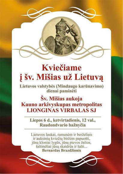 Liepos 6 dieną 12 val. Raudondvario bažnyčioje Kauno arkivyskupas metropolitas Lionginas Virbalas vadovaus šv. Mišioms už Lietuvą. Po šv. Mišių arkivyskupas dalyvaus Kauno r. savivaldybės iškilmingame posėdyje Raudondvario pilyje minint karaliaus Mindaugo karūnavimo dieną.