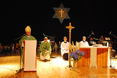 Dienos pabaigoje renginio dalyviai šventė sekmadienio Eucharistiją. Įvade į ją kun. Andrius Končius atkreipė dėmesį, jog šv. Mišiose jau dabar patiriame dieviškąją tikrovę, nes švenčiame drauge su visu dangumi, su visais angelais ir šventaisiais. Perėjimo šventėje atsidavimą Dievui ženklino avinėlio paaukojimas. Šv. Mišiose Jėzus pats yra tas Avinėlis, kuris save paaukoja už pasaulio nuodėmes, ir tai yra mus padrąsinantis Jo meilės ženklas.