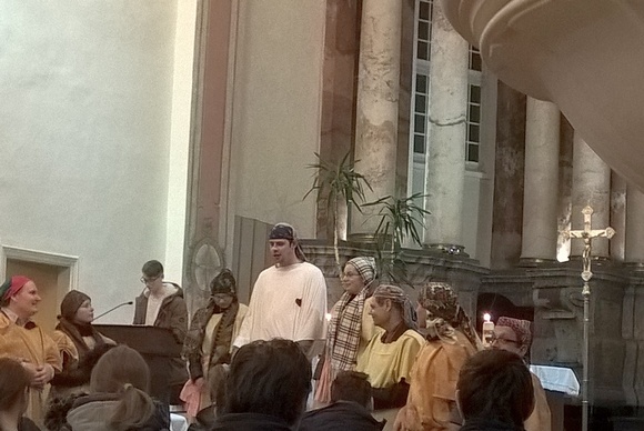 Aktyviai dalyvavę liturgijoje, patys su juos globojančiais savanoriais skaitę skaitinius, ARKOS bendruomenės nariai ir jų vadovas Gedas Malinauskas čia pat prie altoriaus, paskelbus Dievo žodį, gyvai suvaidino Evangelijos vaizdelį – Jėzus savo mokinius, susėdusius prie Mokytojo kojų, moko ir maitina laužoma duona... Nuoširdžiai, gyvai suvaidinto etiudo dėka Jėzus atsirado taip arti visų...