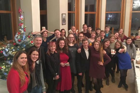 Vakaro programoje dalyvavo apie 30 savanorių. Jie šventė šv. Mišias kurijos koplyčioje, kurioms vadovavęs arkivyskupas kalbėjo apie Dievo skatinimą: „Nebijok.“ Kvietė kiekvieną iš savanorių nebijoti nieko, tik paties Dievo ir leisti Dievo valiai įvykti. Po šv. Mišių buvo dalijamasi kalėdaičiais, išsakomos padėkos bei linkėjimai vieni kitiems artėjančių švenčių proga.