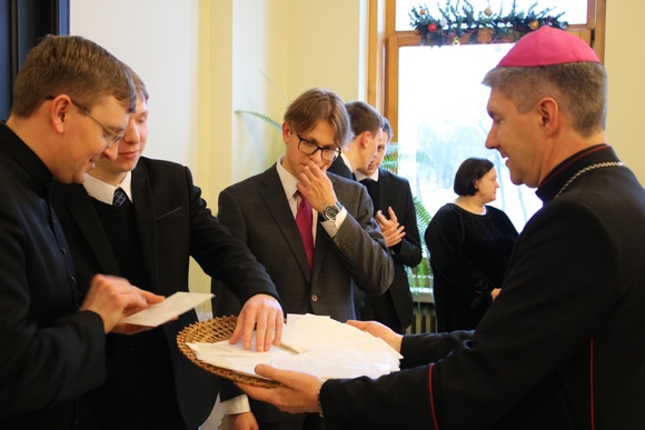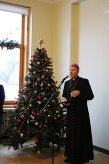 Pasibaigus šv. Mišioms, pasidžiaugę netikėta dovana ir tikrai kalėdine staigmena – prie bažnyčios įkurta prakartėle ir išpuošta kalėdine egle, visi rinkosi arkivyskupijos kurijoje.