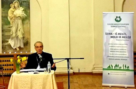 „Šventumas prasideda nuo krikšto. Jį galima išpildyti atliekant kasdieninį darbą“, – sakė garbusis svečias, primindamas šv. Joną Paulių II, kuris pagarbiai elgėsi su kiekvienu žmogumi, pažino kančią ir vykdė kasdienes savo pareigas. O kokiu būdu šeimoje eiti dvasingumo keliu? Ar įmanoma mylėti savo žmoną taip, kaip Kristus mylėjo Bažnyčią? Į šiuos klausimus kardinolas atsakė remdamasis Šventojo Tėvo Pranciškaus posinodiniu apaštališkuoju paraginimu „Amoris Laetitia“. Nuvalkiotai meilės sąvokai reikia sugrąžinti grožį, nes meilė nėra tik emocinis pasaulis ar fizinis ryšys. Lietuvių kalboje turime vieną žodį, bet kitose kalbose yra keletas reikšmių. Eros, philia, agape – vis kiti meilės aspektai. Popiežius Pranciškus primena mums, kokie svarbūs žodžiai šeimoje yra „ačiū, prašau, atsiprašau“. Tačiau nereikia manyti, kad galime pakeisti kitą žmogų, reikia mokėti ir nusivilti kitu.