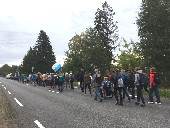 Eisenoje tarnavo jaunieji Jono Pauliaus II centro suburti piligrimai. Jaunimas vadovavo ir giedojimui. Aukštakių šeima eisenos dalyviams dovanojo karštos arbatos ir vaišių.