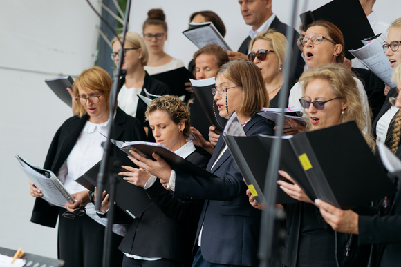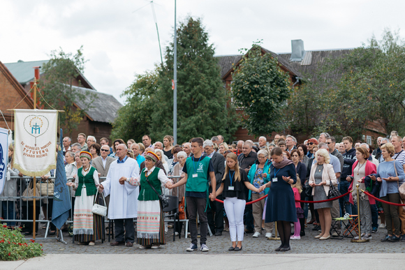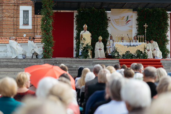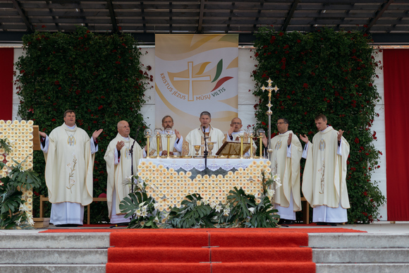 Netrukus aikštėje giedodami Dievo Motinos litaniją piligrimai rengėsi kaip viena šeima švęsti Eucharistiją. Kauno arkivyskupas Lionginas Virbalas SJ pasveikino koncelebruojančius arkivyskupą emeritą Sigitą Tamkevičių, Vilniaus arkivyskupijos augziliarą vyskupą Darių Trijonį, svečią kunigą iš Fatimos, kitus brolius kunigus, ypač tarnaujančius šeimų sielovadoje.