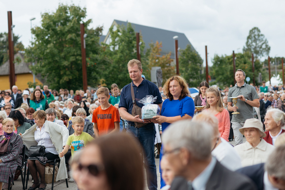 Atnašų procesijoje Kauno arkivyskupijos Šeimos centro savanoriai nešė metodinę medžiagą – pagalbą sužadėtinių rengėjams, o šeimos atnešė duoną ir vyną Eucharistinei aukai.