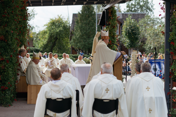 „Todėl mes esame čia, Šiluvoje, žinome visi tą istoriją, kai daugiau kaip prieš 400 metų mūsų protėviai pasitraukė nuo tikėjimo, pabėgo, prieštaravo, ginčijosi, panašiai kaip Petras, dirbo šėtono darbus, skaldė tikėjimą. Visi pasitraukė nuo katalikų tikėjimo ir pabėgo kaip nuo Viešpaties kryžiaus. O Marija stovėjo čia, laukuose, ant akmens ir verkė, verkė ir kvietė sugrįžti. Jos tvirtas įsišaknijimas tikėjime grąžino tautą prie Jėzaus“, – sakė vyskupas A. Jurevičius, be kita, paminėdamas ir artėjantį Šventojo Tėvo vizitą, kuriame galėsime patirti tikėjimą perkeičiantį džiaugsmą.