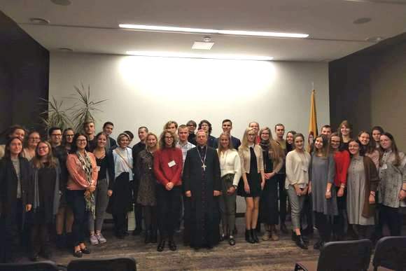 Po pamaldų ir vakarienės studentai ateitininkai susirinko į Domus pacis namus klausyti vysk. Algirdo pranešimo apie Bažnyčios mokymą ir jo kaitą.