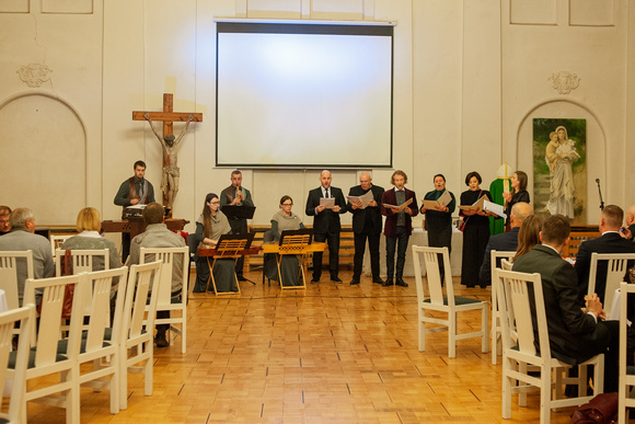 Popiežiaus vadovautų Mišių atmosferą priminė vaizdo medžiaga bei giedotojai, vadovaujami Vitos Liaudanskaitės-Vaitkevičienės, o patį Šventąjį Tėvą – pagarbiai salėje eksponuoti jo liturginiai drabužiai iš Mišių Santakoje bei kiti čia surengtos parodos eksponatai. Vakaro dalyvių džiaugsmui buvo skirti ansamblio „Ainiai“ atlikti kūriniai bei šventinė agapė.