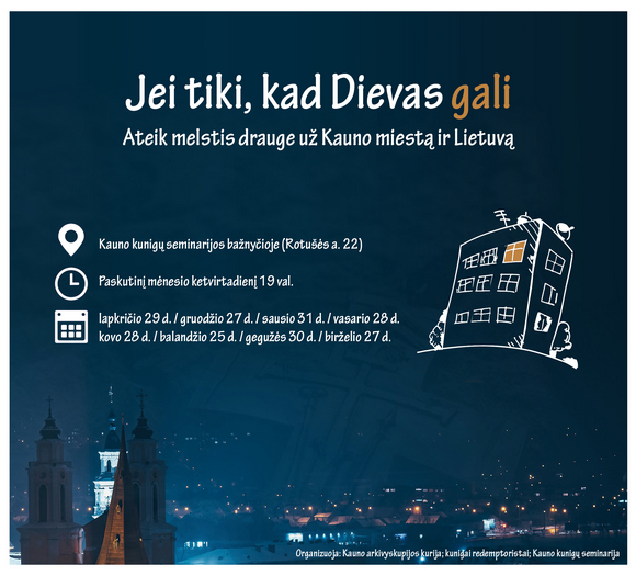 Šie šlovinimo vakarai vyksta paskutiniais mėnesio ketvirtadieniais Švč. Trejybės (seminarijos) bažnyčioje >>. Esate maloniai visi laukiami. Artimiausias vakaras – sausio 31 d.