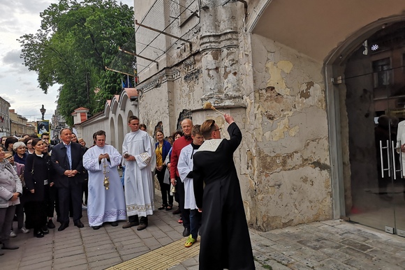 Naująsias bažnyčios duris ir atvertą jos erdvę pašventino bei žmones – šių džiugių šventovei ir miestui įvykių liudininkus – palaimino rektorius kun. Gytis Petras Stumbras. Šia džiaugsminga proga buvo švenčiamos šv. Mišios už bažnyčios lankytojus ir geradarius, jos atgaivinimo minties iniciatorius, savanorius – nedidelėje koplyčioje vos sutilpo šių Mišių dalyviai.