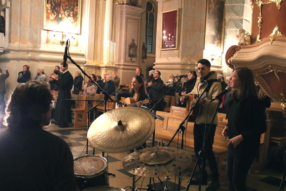 Po šv. Mišių, užbaigtų siuntimu eiti į pasaulį ir palaiminimu, visi buvome pakviesti dar valandėlę pašlovinti Viešpatį ir paklausyti liudijimų, ką šiandien reiškia būti krikščioniu savo aplinkoje. Jono Pauliaus II piligrimų centro bendruomenės narys sakė, jog paliudyti tikėjimą kartais reikia labai nedaug – tik įsisegto kryželio atlape savo darbovietėje ar dviejų žodžių: „aš tikintis“, ir tai padeda susirasti tikėjimo draugų. „Man Bažnyčia yra viltis ir laisvė. Joje yra kažkas tikro“, – sakė jaunas vyras, pabrėžęs bendruomenės svarbą.