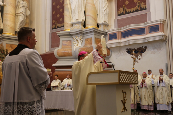 Jis ir paskelbė popiežiaus Pranciškaus bulę, o vėliau pakvietė Eucharistijai vadovauti kardinolą Sigitą Tamkevičių. Eucharistiją koncelebravo visi dalyvavusieji dvasininkai. Patarnavo diakonai Darius Chmieliauskas ir Audrius Jesinskas.