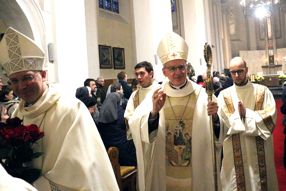 Nuoširdžiai sveikinu čia esančius brolius vyskupus, pradėdamas nuo Jo Eminencijos Kardinolo Sigito Tamkevičiaus, šios arkivyskupijos Arkivyskupo Emerito; sveikinu naujai nominuotą Arkivyskupą Jo Ekscelenciją Kęstutį Kėvalą, kuriam šia proga dar kartą išreiškiu sveikinimus; Jo Ekscelenciją Vyskupą Algirdą Jurevičių, iki naujojo Arkivyskupo ingreso esant į šios Arkivyskupijos Apaštališkuoju Administratoriumi; taip pat Šiaulių vyskupą Eugenijų Bartulį. Šilčiausi sveikinimai taip pat gerbiamam Seminarijos rektoriui kunigui Ramūnui Norkui, taip pat ir visiems kunigams, kartu koncelebruojantiems Šventąsias Mišias. Ypatingi sveikinimai vienuolėms ir vienuoliams bei visiems pašvęstiesiems asmenims ir, be abejo, visiems brangiems seminaristams, besiruošiantiems kunigiškajai tarnystei. Visiems jums, brangūs broliai ir seserys, noriu pasakyti, kad nuolat prisimenu jus savo maldoje už jūsų dabartinę tarnystę Bažnyčioje, taip pat ir už jūsų būsimą tarnystę, kurią Viešpats visiems jums ruošia.