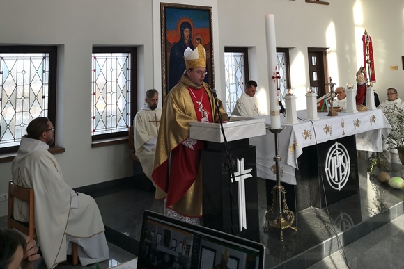 Homilijoje vyskupas Algirdas pasidalijo Lietuvos vyskupų velykiniu sveikinimu >>. O paskui, kreipdamasis į brangius žmones, pasveikino ir savo vardu. Atjausdamas nelengvai išgyvenamas, tačiau supratingai žmonių priimamas karantino sąlygas, ganytojas padrąsino palaimintojo Teofiliaus Matulionio pavyzdžiu – net 15 savo gyvenimo Velykų šis vyskupas negalėjo laisvai švęsti, nes buvo įkalinime. Ir net 7 metus negalėjo švęsti Mišių, o šv. Komuniją priimdavo dvasiniu būdu, taip, kaip mes šiuo metu (sveikinimą vaizdo reportaže žr.čia >>)