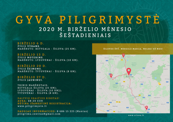 Nuėjusiems vieną iš trijų maršrutų bus įteiktas piligrimų pažymėjimas su Šiluvos šventovės anspaudu. Visos kelionės metu laikysimės Vyriausybės nustatytų reikalavimų saugojantis Covid-19 viruso. Daugiau informacijos apie šios piligrimystės žygius galima rasti www.piligrimyste.lt