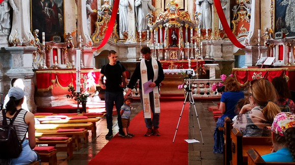 Bažnyčioje pasitinka klebonas ir skuba pas vestuvininkus. Už pagrindinio altoriaus – šv. Jonui Pauliui II skirta koplyčia su kraujo relikvija.