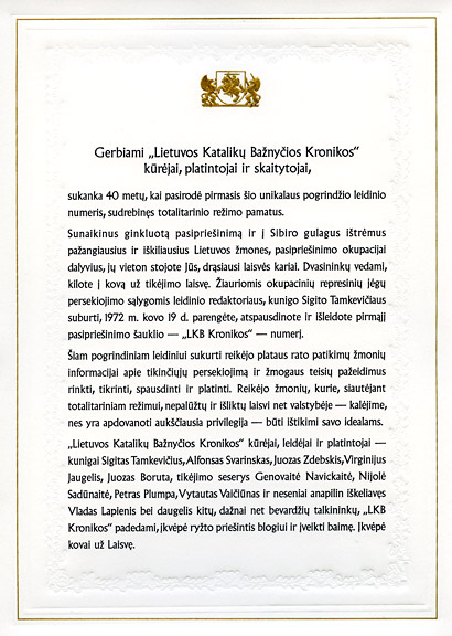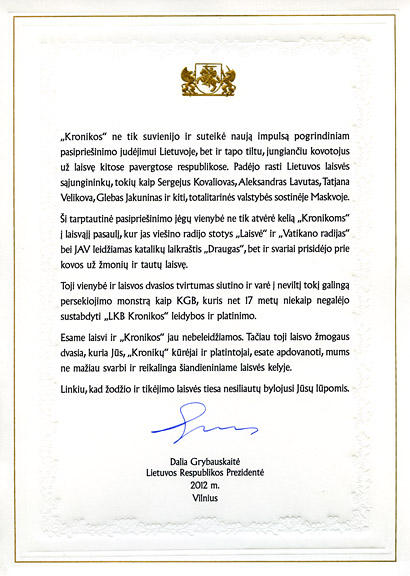Lietuvos Respublikos Prezidentės Dalios Grybauskaitės sveikinimas „Lietuvos Katalikų Bažnyčios kronikos“ kūrėjams, platintojams ir skaitytojams