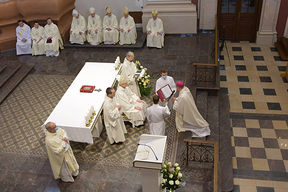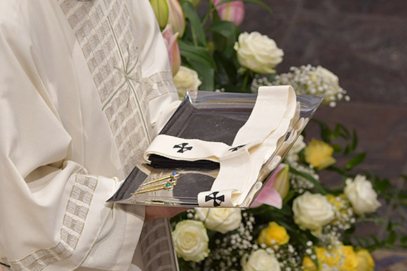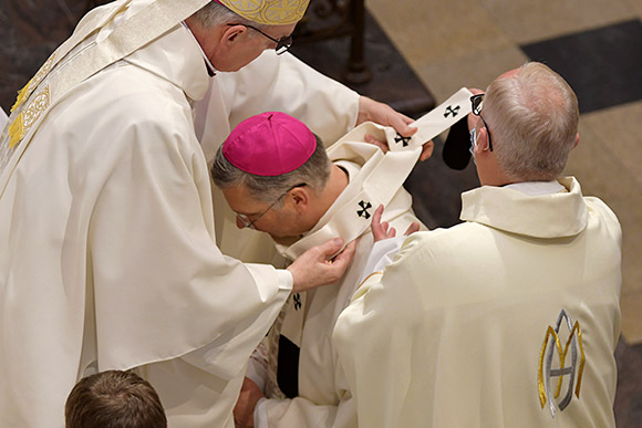 Palijų – ėriuko vilnos juostą, dėvimą ant liturginių drabužių, – prisilietusį prie apaštalo Petro kapo Vatikane ir palaimintą popiežiaus Pranciškaus, arkivyskupui uždėjo apaštališkasis nuncijus Baltijos šalyse arkivyskupas Petaras Antunas Rajičius.