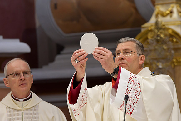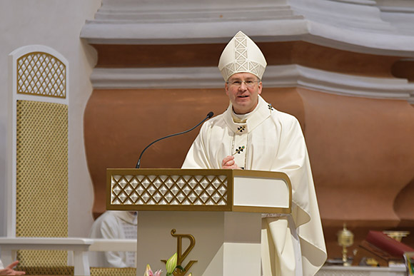 Vėliau Eucharistijos liturgijai vadovavęs arkivyskupas Kęstutis pasakė homiliją, kurioje atkreipė dėmesį į naują mūsų užkalbinimą per šios dienos Dievo žodį ir jame nuskambėjusį Jėzaus klausimą ne tik Simonui Petrui, bet ir kiekvienam: „Ar myli mane?“ (plg. Jn 21, 15–19)