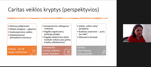 Vėliau prelegentai pristatė arkivyskupijos Carito veiklą. Labai svarbu šioje veikloje stiprinti katalikiškąją tapatybę. Bendraujant su parapijų klebonais, išryškėjo keletas svarbių temų. Kaip viena didžiausių problemų daugelyje parapijų, kurią nurodė klebonai, tai drabužių dalijimo klausimas. Ar tai reikalinga, kaip efektyviau tą atlikti? Konstatuota, kad šiai problemai spręsti reikia drąsos ir iniciatyvumo. Kita svarbi tema, išryškėjusi pokalbiuose su klebonais, – karitatyvinės veiklos samprata ir jos atnaujinimas. Veiklos sėkmė labai priklauso nuo to, kaip žinia komunikuojama. Buvo pasidalyta mintimis ir apie perspektyvas, į ką reikėtų kreipti dėmesį. Pokalbiuose su klebonais išryškėjo išklausymo tarnystės, galimybės susirinkti ir kartu švęsti bendrystę konkrečioje vietoje ar parapijoje įrengtoje kavinukėje, kompiuterinio raštingumo mokymo, pagalbos elektroniniu būdu tvarkant reikalus svarba. Tai naujosios karitatyvinės veiklos formos. Pasak prelegentų, labai svarbus ir vienišumo mažinimas skatinant kartų bendradarbiavimą, senolių lankymą ir netgi „įsisenelinimą“.
