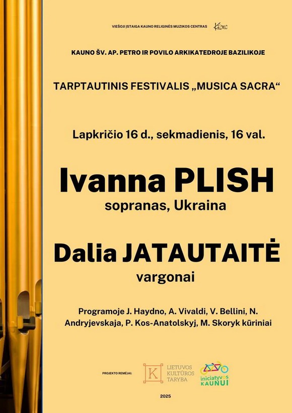 Lapkričio 16 d., sekmadienį, 16 val. Kauno arkikatedroje bazilikoje tarptautinio festivalio „Musica sacra“ koncertas. Dalyvaus solistė iš Ukrainos Ivanna Pliš ir vargonininkė Dalia Jatautaitė.