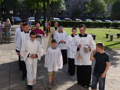 Kauno I dekanato dekanas mons. Vytautas Grigaravičius, parapijos klebonas, kunigai ir tikintieji Sutvirtinimo sakramento šventimo proga prieš vakaro pamaldas į šventorių išėjo sutikti garbingų svečių: Kauno arkivyskupo Sigito Tamkevičiaus ir kurijos kanclerio mons. Adolfo Grušo. Jaunimas savo giesmėmis šlovino Dievą, prašė Šventosios Dvasios dovanų visiems tikintiesiems, o ypač parapijos jaunimui ir suaugusiems, šv. Mišių metu priėmusiems Sutvirtinimo sakramentą.