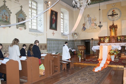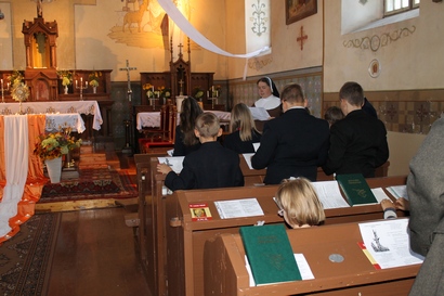 Taigi ir šį kartą kunigas mielai atvyko į bažnyčią. Po įžanginės giesmės bei tikybos mokytojos pristatytos pamaldų eigos, lydint gitaros akordams ir giesmei, prašant Jėzų ateiti, ant žvakelių šviesa spindinčio altoriaus jis atnešė Švč. Sakramentą. To tylios maldos dėmesys buvo nukreiptas į išdalytus tekstus. Visi susirinkusieji turėjo progos dviem chorais pagal suolų eiles pasimelsti Biblijos psalmių tekstais, tarsi valandų liturgijoje. 33-oji psalmė prasidėjo, o 15-oji psalmė pasibaigė bendru tarsi mažon kaimo bažnytėlėn kukliai susirinkusios tautos pažadą išreiškiančiu atliepu: „Vaikščiosiu, Viešpatie, Tavo šviesos tiesoje.“