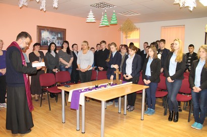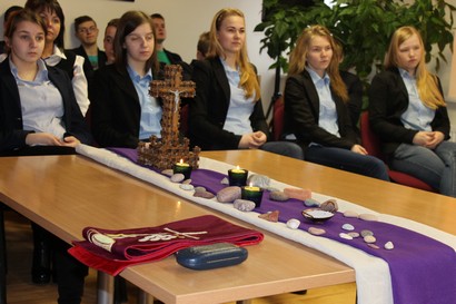 Apeigų dalyviai, pradžioje pagiedoję giesmę „Išdžiūvus visa žemė“, tikybos mokytojos buvo paraginti naujai pradėti šį laiką ir atsiliepti į Gailestingumo metų kvietimą labiau mylėti. Žodžio liturgijoje, skaitant Šventojo Rašto skaitinius, talkino mokyklos lituanistės mokytojos Aistė ir Dovilė.